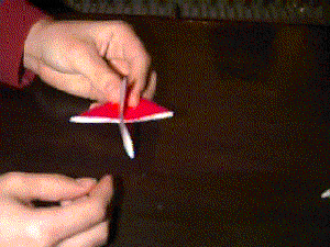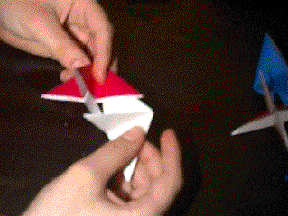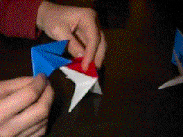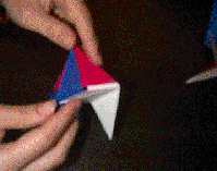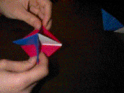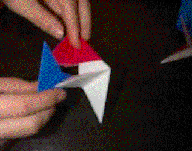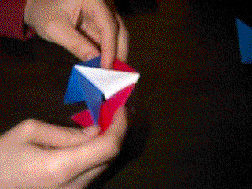 5. The challenge now is to complete the model! Take the second red unit. You want it to be opposite the first red unit and have the flaps in the horizontal plane on the outside. Orient it to be facing the first red unit, and poke a flap into the blue flap opposite the one that is over the flap of the first red unit. Similarly, poke the mate of the white flap that pokes into the other red unit into this red unit.