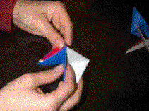 1. The unit is the water bomb base: the tent that collapses to be a triangle, with two flaps on each side. Make 6 of these in sets of 2 for each of three colors. We will assume the colors are red, white, and blue.