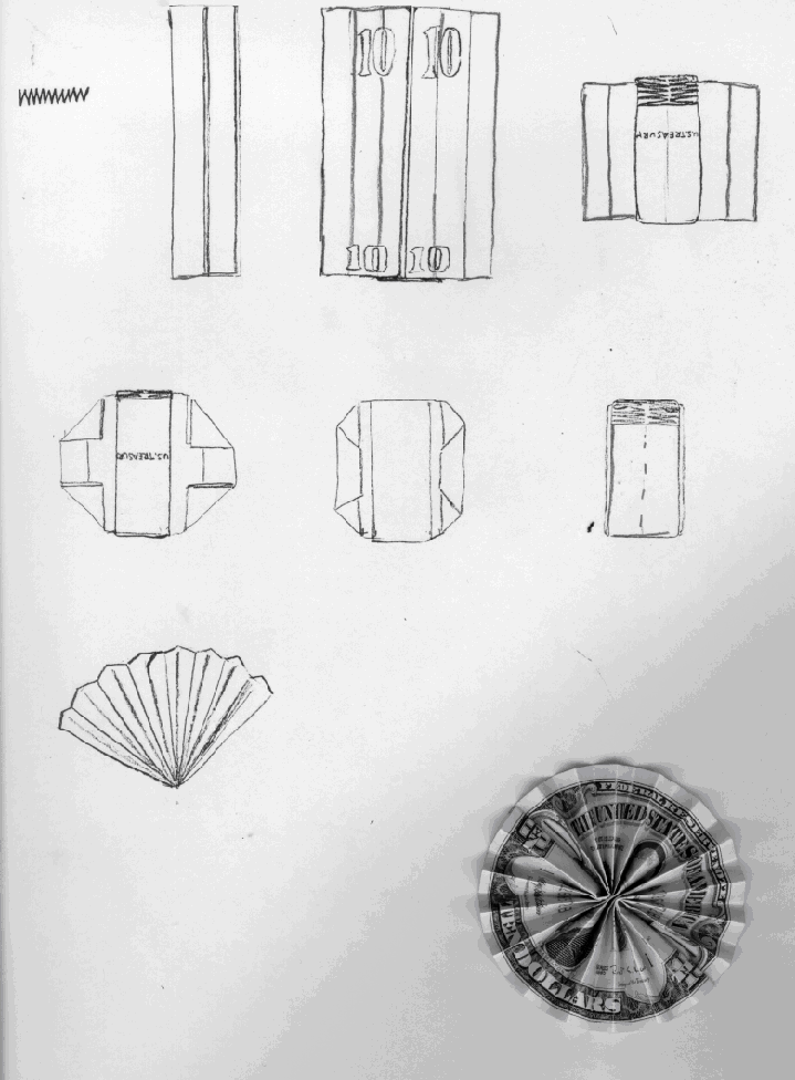 The tasks and questions described for the traditional models can also be used with the dollar bill rosette. For example, students can be asked to determine the radius of the circle. Why 11 (or 22?)? Students can try alternatives to see how they work, perhaps 8 (16) or 16 (32). You can also assign the task of teaching the model and explaining each or any step of the procedure. Students may want to race through the moves, but make clear that the sign of a well-done job is that members of the audience master the model.